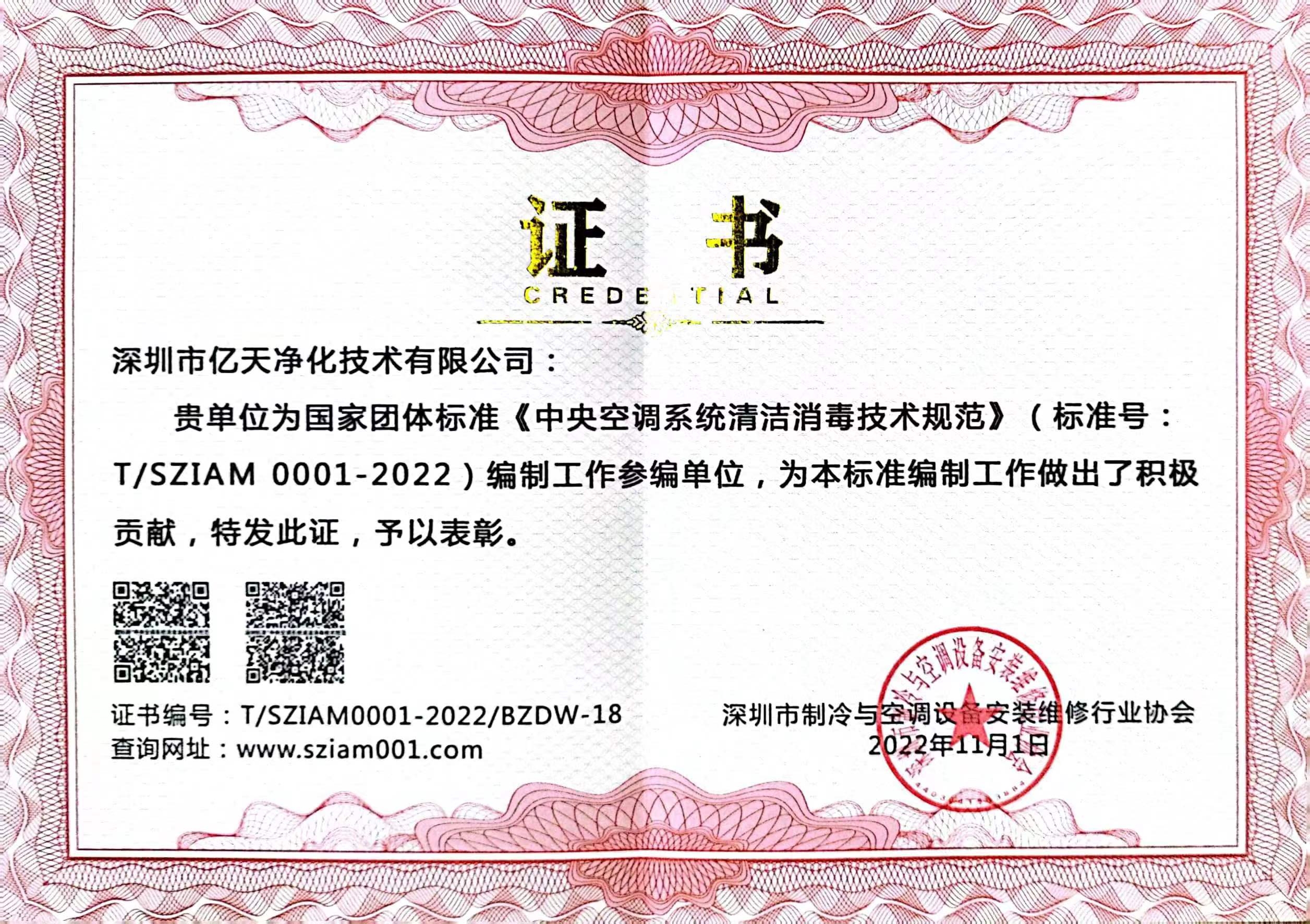 近日,由深圳市制冷與空調設備安裝維修行業協會(簡稱深冷協)主導發起、深圳市億天凈化技術有限公司參編的《中央空調系統清潔消毒技術規范》T/SZIAM0001-2022團體標準正式發布實施。該標準主要對中央空調系統的清潔和消毒提出了一整套完整的專業技術規范、標準以及相關的具體操作流程、作業方法等,對中央空調系統乃至整個制冷行業的清潔消毒技術的發展具有非常重要的意義。