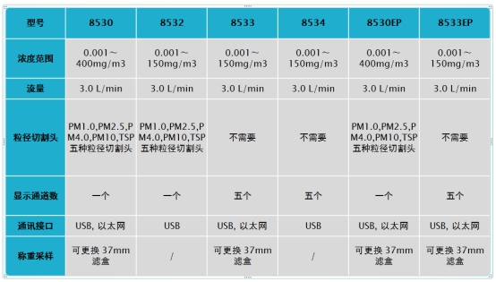TSI 常用幾款便攜式粉塵檢測儀技術參數對比表: